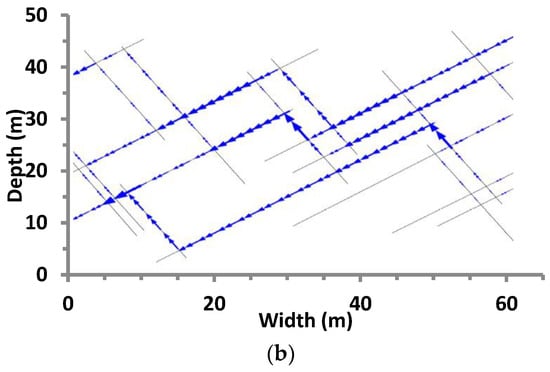 where and are the fluid pressure at nodes i and j, and are the piezometric heads at nodes i and j, respectively; is the density of fluid, and is the acceleration of gravity. It can be deduced from Equation (9) that the flow rate can be calculated under a gravity effect when both fluid pressures are zero. Since Darcy’s law for fluid flow has been widely applied to simulate porous media [8,9,33], the “cubic law” can adequately compute fluid flow through the fracture network.