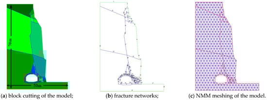 In this study, the proposed seepage–deformation model by the NMM method is used to simulate the failure process of a rock slope with a tunnel and to calculate FoS considering the effects of fracture flow on the rock masses. As shown in Figure 15, the NMM model consists of rock blocks and fracture networks containing both the existing fractures and virtual/potential fractures. The height and width of the slope are selected as 70 m and 50 m, respectively. A total of 1427 PCs, 2053 MEs, and 46 flow segments are obtained, and 208 measured points are prescribed to calculate the fluid flow rates of the fracture network system. The aforementioned fracture network is taken as a seepage path, and the strengths of potential failure features are considered as being equal to those of the intact rock mass. The division of blocks is investigated after a collapse disaster [50,51]. The input parameters, based on the investigation and experimental results, are listed in Table 3.