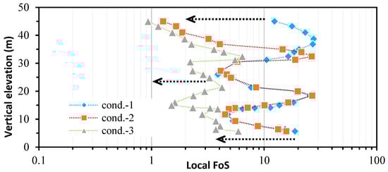 The local FoS can be calculated by Equation (36), and the distribution of the local FoS along the main sliding surface under the three prescribed conditions is plotted in Figure 16. It can be seen that each local FoS represents the typical stability state of a segment of sliding surface (i.e., l/2 in Equation (33)). When the effect of fracture flow is not considered under Condition 1, the FoS of the other parts is greater than 4.0, except for the FoS of 3.95 near an elevation of 26.37 m (see Figure 16). This shows that the slope is stable without considering groundwater.
