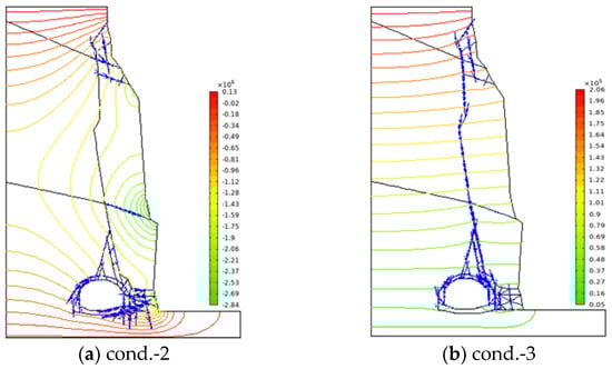 When Condition 2 is considered, the water flow and pressure head of groundwater along the fracture are shown in Figure 17a. It can be seen that the groundwater flows out from the outlet points on the slope, which shows that the water flow calculated by the NMM is reasonable. Although the drainage of the slope is considered, there is still high water pressure in the top segment, which causes a large tensile stress of 0.833 MPa near an elevation of 45.2 m (see Figure 16). Therefore, the local FoS at the top segment of the main fracture is declined dramatically, and the minimum FoS decreases to 1.26 to approach the limit equilibrium state. On the contrary, under Condition 3 (see Figure 17b), the groundwater cannot flow out along the rock slope surfaces, and the hydraulic pressure is equal to the difference between the highest water head and the elevation of each segment (i.e., ). Then, near the bottom of the slopes, the pressure head is greater, which decreases the local FoS along the whole sliding surface (see Figure 16). However, the minimum FoS still appears at the top of the slope, as the open fracture is less than 1.0, which creates the instability of the slope.