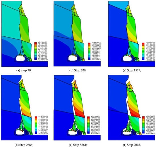 Simulated failure process of the rock slope (unit: m): (a) step 0; (b) step 620; (c) step 1527; (d) step 2866; (e) step 5161; (f) step 7015.