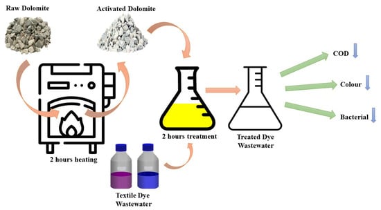 Recently, some studies showed that dolomite possesses adsorption capability due to its surface area and composition of calcite and magnesite, which allow it to immobilise metals and pH-neutralising agents in wastewater [,]. The adsorption properties of raw dolomite, such as specific surface area and pore volume, can be improved by thermal treatment of the material through partial calcination []. Additionally, this process increases the presence of functional groups on the surface of the dolomite, such as hydroxyl (OH), carboxyl (COOH) and metal ions, which may affect the pH of the effluent []. However, dolomite waste can be recycled using a desorption technique to stop pollutants from being unintentionally leached. Some studies have shown the low possibility of a leaching process in dolomite []. While research on synthetic textile dye wastewater has been conducted recently, real textile dye wastewater applications could be more frequently studied. Moreover, a study was performed on microbes’ inhibition in wastewater due to pH alteration. This study investigated the optimal temperature for dolomite calcination for a better adsorption rate of colour and COD in the dye wastewater.