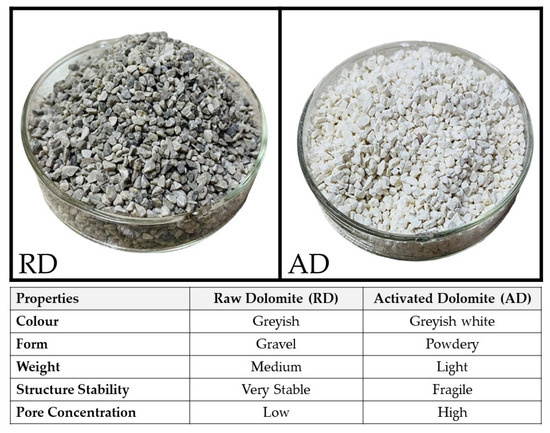 Figure 2 demonstrates a comparison of features. Activated dolomite, which has a more greyish-white colour from carbonisation, is significantly greyer than raw dolomite. An increase in pore density following heat treatment, essential to adsorption as the active site for the dye binding site, makes activated dolomite lighter in weight [].