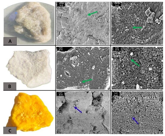 When compared to raw dolomite and untreated activated dolomite as a control, activated dolomite exhibited dye adsorption (pores: green arrows in Figure 3A,B), which was followed by increasing densities of clumps on the pores, indicating that the dye molecules had coated the dye-adsorbed dolomite. The control dolomite in Figure 3A,B (left pictures) is grey, indicating that it is unsaturated, which is consistent with the findings of [,]. The blue arrows are in Figure 3C.