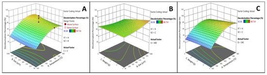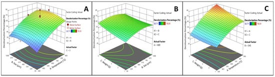Figure 5 shows 3-D graphs exhibiting the effects of temperature, size and weight. Each panel depicts the two factors at their optimal levels while keeping the experimental range of the third factor constant. Figure 5A,C demonstrates that, in the dye decolourisation process, the activation temperature was very significant (p = 0.0001), while the other parameters were only marginally significant. Figure 5B demonstrates how the adsorbents’ weight minimally impacted decolourisation, whereas the adsorbents’ size was planar because it had no appreciable influence on the process.