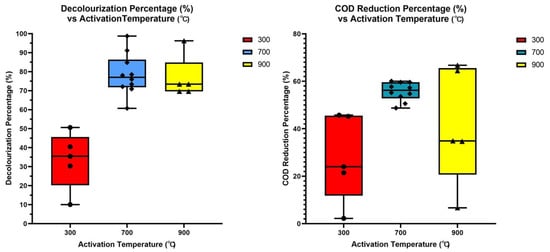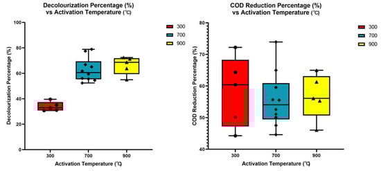 In Figure 6 and Figure 7 (right), the RTDW and STDW were analysed for chemical oxygen demand (COD) to ascertain the affinity of the adsorbent for different compounds present in textile effluent. The 900 °C-activated dolomite provided the maximum removal of COD, at 69.0% as indicated by the data, verified by the triplicated studies performed on each sample. Significant discrepancies were shown in the samples treated by 300 °C- and 900 °C-activated dolomite as the COD reduction was inconsistent for each treatment. As for STDW, the COD reduction percentage showed average trends within the range of 50.0% to 65.0% for each activation energy.