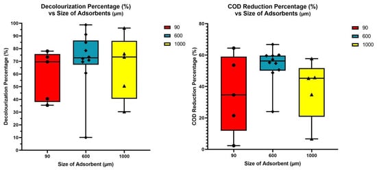 Figure 8 and Figure 9 (left) depict that the size of the activated dolomite adsorbent utilised in this investigation had a considerable impact on the removal of colour. In the RTDW treatment (Figure 8 (left)), the 600 µm size had the maximum colour removal (98.7%), followed by 1000 µm (96.2%), while the average decolourisation percentage was 70.0% for every size. The results are similar to the STDW treatment in Figure 9 (left), as 600 µm had the highest colour removal percentage (78.0%). However, the sizes utilised in the treatment are comparable since they can adsorb the dye onto their surface and because they are chosen in small particles, which generally have a higher rate of dissolution due to their larger surface area to volume ratio and, therefore, a better possibility for faster absorption.
