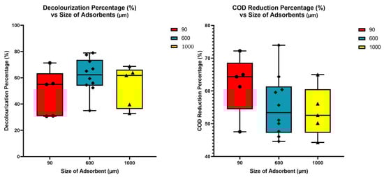 The decolourisation percentages (left) and COD reduction percentages (right) of RTDW based on the size of adsorbents in µm.