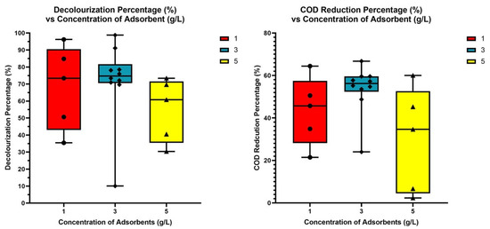 As well as determining the size of the dolomite and the influence of activation temperature, the concentration of adsorbents in the treatment was examined. Even though dolomite has been relatively non-toxic to the environment, it is a physical substance that cannot be easily broken down. The experiment was based on a concentration from a prior study [], which found that when activated dolomite concentrations were 50 mg/L, it was possible to assess their efficacy. Additionally, the author conducted a preliminary experiment in which dye water was treated with 0.5 g of activated dolomite. Therefore, constant concentrations of activated dolomite of 1 g, 3 g and 5 g in the bioreactor at an agitation speed of 100 rpm and room temperature are recommended to achieve the best results.