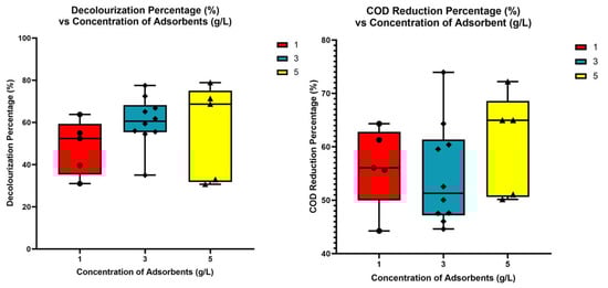 Figure 10 and Figure 11 show that the optimal number of adsorbents to use in the treatment is between one and three. The concentration of binding sites on the surface affected the decolourisation and reduction in COD. The ability for reduction increased as the surface area increased. However, the reduction reached an equilibrium phase after a predetermined interval and slowed down due to concentrated binding sites with the constituents in the effluent []. However, amongst the variables applied in the treatments, activation temperature in preparing the adsorbents affected decolourisation and COD reduction most strongly in this study.