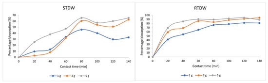 STDW and RTDW percentage biosorption onto activated dolomite against time. (Experimental conditions: Co STDW = 100 mg/L; Co RTDW = ~10.0 mg/L; absorbent dosage = 1.0 g, 3.0 g and 5.0 g per 100 mL, dolomite T = 700 °C, particle size > 1.0 mm, mixing rate = 100 rpm, T = 25 ± 1 °C).