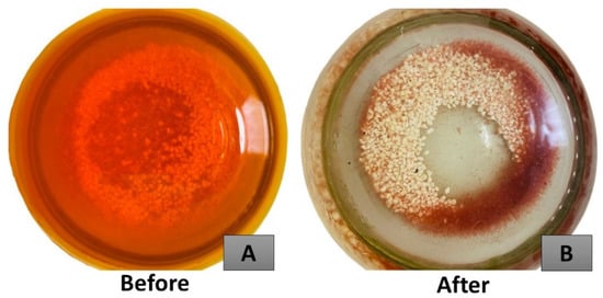 Each sample was drawn using a dropper for the decolourisation assay, transferred into a cuvette and then tested using UV-visible spectrophotometry (Shimadzu UV Mini 1240 Europe, Duisburg, Germany). The RTDW and STDW samples’ absorbance wavelengths were 420 nm and 464 nm, respectively []. The adsorbed sum was determined by the difference between the beginning and end values. The percentage of decolourisation was then determined using Equation (1):