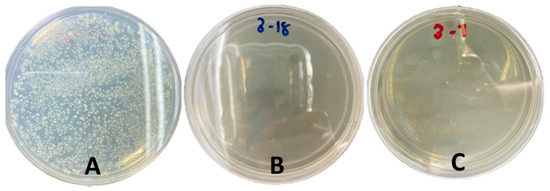 Antimicrobial analysis on nutrient agar (NA). Control (A), RTDW (B) and STDW (C). The samples were incubated for 24 h at room temperature.