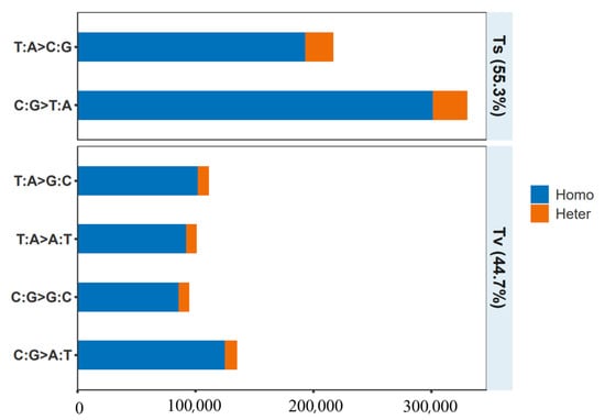 The types of SNP base substitution are divided into two: transition (TS) and transversion (TV). Transition occurs between A and G or C and T, and the transversion occurs between A and C, A and T, G and C, and G and T. The mutation type characteristics of each point in SNP typing results were statistically analyzed. The transformation type is the most numerous, accounting for 55.3% of all base mutation types. The inversion type is the least numerous, accounting for 44.7% of all base mutation types. The ratio of transition to transversion (TS/TV) in SNPs was 1.237 (Figure 2).
