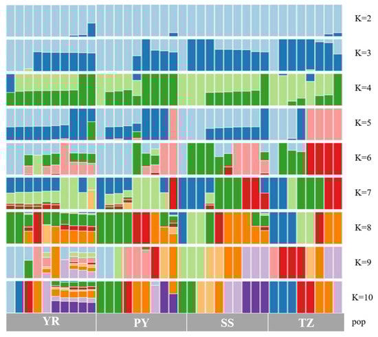 Population structure of Coilia nasus by SNPS Analysis (K = 2–10). Note: Each column in the picture represents an individual, and the length of different color fragments represents the proportion of an ancestor in the individual’s genome.