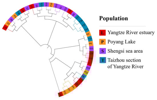 The genetic variation and differentiation among four populations of C. nasus in the Shengsi Sea area, the Yangtze River estuary, the Taizhou section of the Yangtze River and Poyang Lake were analyzed. In this study, the FST of four C. nasus populations ranged from 0.112 to 0.142, with an average of 0.1235 (Table 3). According to Wright’s division of the genetic differentiation index, the FST value of populations is 0–0.05, and the differentiation is very small, which can be ignored. The FST value of populations was 0.05–0.15, and there was moderate genetic differentiation among the populations. The FST value of the populations was 0.15–0.25, and the genetic differentiation between the populations was large. The populations’ FST value was greater than 0.25, and there was great genetic differentiation among populations [,]. Among them, the genetic differentiation coefficient between the Yangtze Estuary and the Shengsi population was 0.112, and the genetic differentiation coefficient between the Poyang Lake and the Taizhou section of the Yangtze River was 0.142.