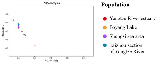 The phylogenetic tree reconstruction and principal component analysis of SNP were carried out in four C. nasus populations in the Shengsi Sea area, the Yangtze River estuary, the Taizhou section of the Yangtze River and Poyang Lake. In the phylogenetic tree, except for T14, T27, T34 and T37, other individuals of the four C. nasus populations were hybrid and related (Figure 4). For the principal component scatter plot, only one individual in Poyang Lake was isolated, and the remaining individuals overlap with each other (Figure 5).