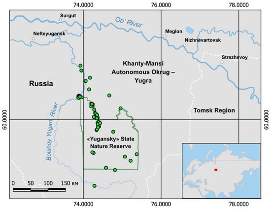 Map of sampling localities of gastropods in minor water bodies of the Bolshoy Yugan River basin. Localities are marked with green circles and correspond to those in Table S1 (Supplementary materials). The axes of the figure show geographic coordinates.