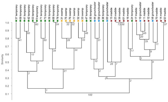 Regarding the dendrogram of hierarchical cluster analysis obtained using the Dice index as a measure of similarity (Figure 4), only two high-level clusters were reliably distinguished with 100% bootstrap support. The first cluster combined most of the temporary habitats and all swamp water bodies. The second cluster included madide habitats and springs. The classification was not fully accurate, since a few of the temporary habitats were placed in the second cluster, which was contrary to the tendency of these localities to concentrate in the left part of the dendrogram. The allocation of lower-rank clusters had negligible or weak bootstrap support in all cases.