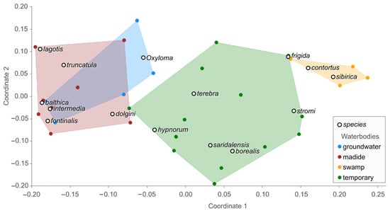 The ordination diagram yielded by Nonmetric MDS (Figure 5) revealed three distinctly separated groups of gastropod habitats corresponding to three types of the a priori classification of minor water bodies of the Bolshoy Yugan River basin. Similar to the dendrogram above (see Figure 4), groundwater springs and madide habitats formed a common group. When grouping habitats, the NMDS method also made it possible to visualize the species’ habitat preferences in the space of variability scales. For example, groundwater springs and madide water bodies were typically inhabited by the same gastropod species.