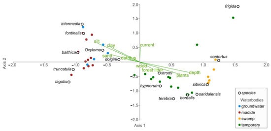 As a method of direct ordination, we chose Canonical Correspondence Analysis (CCA), which contributes to the interpretation of the results obtained by taking environmental factors into consideration. The method is suitable for studying the influence of a complex of factors that may be dependent on each other. The CCA algorithm solves the problems of both ordination and regression analysis by statistically assessing the order of species and habitats under the influence of external factors [39]. Information on the following environmental factors was used: depth at the sampling sites (in meters); presence and velocity of the current (score: 0, current is absent; 1, low velocity; 2, high velocity); the percentage of submerged plants, wood debris, and forest litter in the composition of substrates; the percentage of detritus, silt, sand, and clay in the bottom substrate.