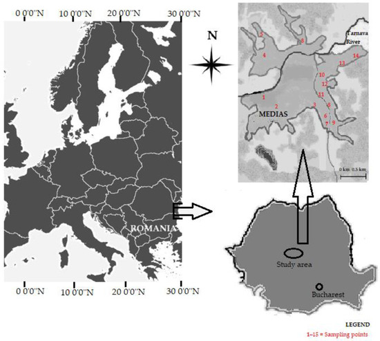 The current preliminary study was carried out in an urban area (Medias, a small town with approx. 44,000 inhabitants, in 2011), situated in the central part of Romania, nearby a metallurgical industrial plant (Figure 1). Placed at an altitude of approx. 300 m, with a surface area of 62 km2, it is split by the Tarnava River.