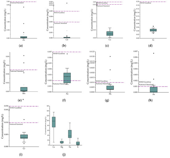 The heavy metals and metalloids concentrations ranked as follows in the studied water samples: Zn > Mn > Cu > Cr > Ni > Pb > Cd > As (Figure 2a–i). The highest variation in the obtained results was in the case of Zn, which varied from 0.007 to 1.91 mg/L among the sampling water wells. However, 70% of the studied samples’ Zn concentrations were below 0.100 mg/L. In the case of Cd (Figure 2b), Pb (Figure 2g), As (Figure 2h), Mn (Figure 2e), Ni (Figure 2f) and Cr (Figure 2i), the concentrations exceeded the national standard and/or WHO guideline values only in a few cases; while heavy metals such as Zn (Figure 2a), Cu (Figure 2c), and Fe (Figure 2d) were lower than the national standard and WHO recommendation guideline values [29,30].