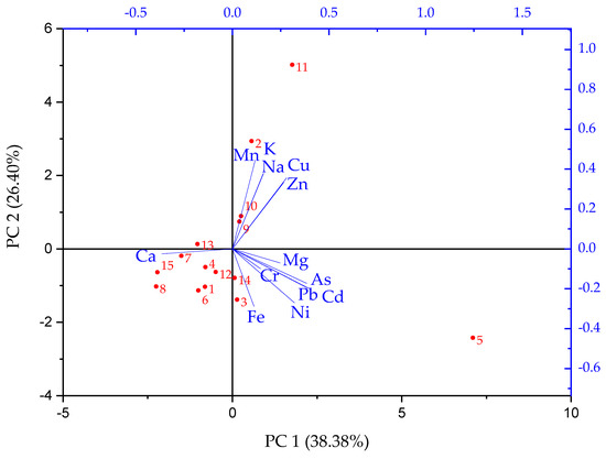 The principal component analysis (PCA) showed a total variance of 64.8% with a variance of 38.4% for the PCA1, 26.4% for the PCA2 (Figure 3). The major contributors for PCA1 with a moderate positive loading are Fe, Ni, and Cd and a negative loading in the case of Ca. While, for PCA2, a positive loading was observed on Na, K, Mn, Cu, and Zn. Therefore, the obtained results show two outstanding sampling points (5 and 11) with no correlation with the other sampling points, indicating the differences in the metal concentrations.