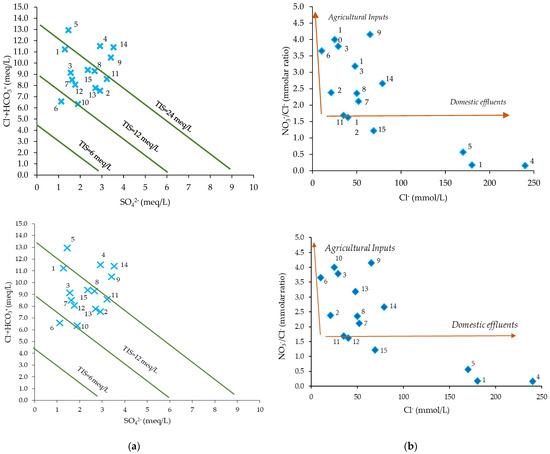 As indicated in Figure 4b, generally, the main sources of Cl− and NO3− are correlated to agricultural inputs. The inhabitants practice agriculture and use fertilizers based on nitrogen. They also raise livestock and the animal waste represents sources of nitrogen compounds. Samples 1, 4 and 5, characterized by the highest Cl− amounts, are influenced by domestic effluents, possibly wastewaters coming from household activities, but also by the soil weathering.