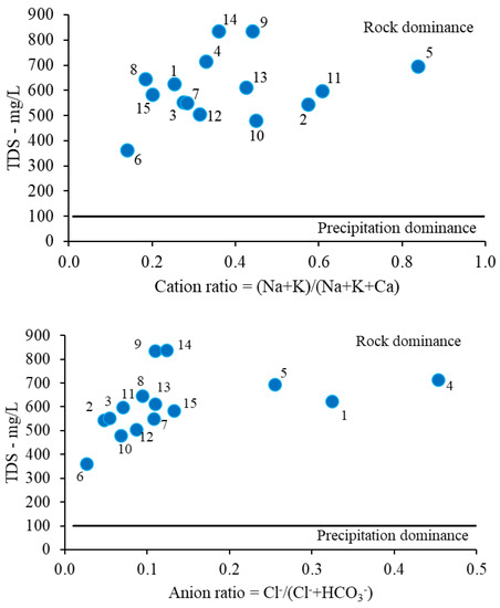 According to the Gibbs diagrams, represented in Figure 5, all chemical processes and the hydrogeochemical evolution of the studied waters have rock dominance. The correlation of high amounts of Cl−, SO42− and HCO3− characterizes the waters with high salinity. Figure 4a indicates the TIS distribution and classification of the studied water samples. The TIS diagram indicates that the majority of samples have a TIS of 12 meq/L, and only one sample (6) has a TIS of 6 meq/L. Less than 30% of the samples have a high TIS (=24 meq/L).