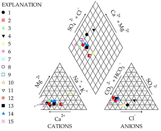 The typology of waters was classified using the Piper diagram. Based on the major cations and anions, the Piper plot indicates the water types. The majority of samples are included in the CaMgHCO3− typology. Samples 4 and 5 are classified into the mixed typology. The mixed typology of those two samples is correlated to the highest amounts of nitrogen compounds, SO42−, Cl−, HCO3−, and also the highest values for the EC, TDS and tH. Based on the cations trilinear plot, samples were generally included in the calcium type, except samples 2 and 11, which were not characterized by any dominant type. On the other side, the trilinear anions plot groups two water types, namely sulphate type (samples 2, 3, 5–15) and non-dominant type (samples 1 and 4) (Figure 6).