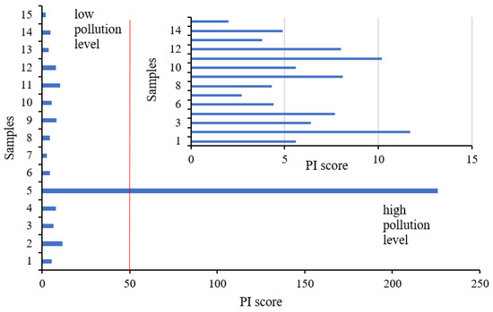 PI scores ranged between 2.0 and 226, with the highest score being obtained in sample 5, characterized by the highest Cd, Ni and Pb amounts. Cd exceeded the MACs more than two times. Sample 5 also contained high amounts of Cr, Cu, Fe and Zn. Thus, the high amounts of heavy metals were correlated with the PI scores. Sample 5 was likely the most vulnerable to Cd contamination through atmospheric deposition. Two pollution levels were obtained, based on the PI, namely low and high pollution, as presented in Figure 7. Sample 5 had a high pollution degree, while the majority of samples were characterized by a low pollution level. Samples 2 and 11 had the second-highest PI scores, but still under the limit (50 mg/L), obtained by Bhuiyan et al. [31]. These high PI scores were correlated with the high Cu and Mn concentrations, in sample 2, exceeding the MAC for Mn, by almost two times, while the PI score in sample 11 was related to the highest amount of Zn and high Mn concentration, exceeding the MAC at 16 mg/L. Samples 7 and 15 had the lowest PI scores (PI < 3.0), which recommended both samples as being safe for consumption.
