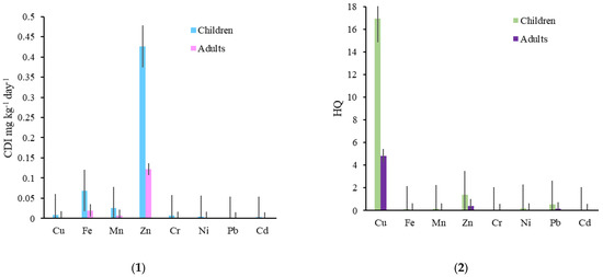 Risk assessment of heavy metals through water ingestion expressed as cumulated CDI (1) and HQ (2) scores for adults and children.