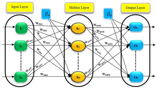 In Figure 1, an ANN is depicted alongside a hidden layer and some weights linking the layers. The following steps should be considered while calculating the output values. First, the sum of weights is defined by Equation (1), where is the input variable, is the weight between , and neuron j, and shows the input variable’s bias term.