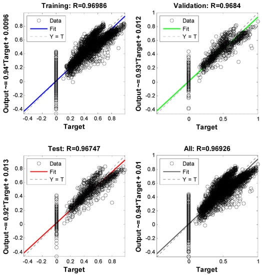 Regression analysis, where the network’s output is compared to the corresponding targets (often represented by a regression factor) is another method for gauging the generalization of a network (R). R = 1 (1.0) if the network performed perfectly; however, this is rarely the case. Figure 4 shows the regression plot with R = 0.9692.
