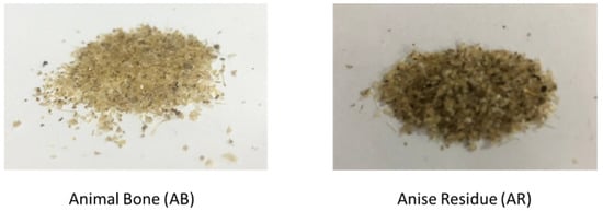 Visual representation of the adsorbent materials used: animal bone (AB) and anise residue (AR).