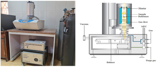 Thermogravimetric analysis (TGA) is a method used to determine a material’s thermal stability, moisture content, and volatile components by observing its weight change during constant heating. This study utilized a Linseis STA PT 1600 instrument for TGA analysis. Specifically, 12 mg of AR and 14.5 mg of AB were placed in the instrument’s holder, and Nitrogen gas was used to purge the system at a flow rate of 1 mL/min. The sample was heated to 900 °C at a rate of 5 °C/min and then cooled at a rate of 20 °C/min. Figure 2 displays the instrument’s pictorial view and its operational principle.