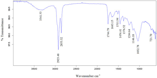 Spectrophotometry is among the important techniques in the diagnosis of different materials and is characterised by the fact that its performance is simple, fast, and cheap. This technique is used to identify hydrogen bonds, functional groups and chemical bonds [28]. In the present work, the functional groups present in ABs and ARs before and after the adsorption of oil were investigated by FTIR (BRUKER, Ettlingen, Germany) analysis to identify changes that may occur in the vibrational frequency of the functional group of the adsorbents after adsorption of oil. The FTIR spectrum measurement was recorded in the wavenumber range of 600–4000 cm−1. The spectrum recording method employed was the attenuated total reflectance (ATR) method with a resolution of 0.085 cm−1.