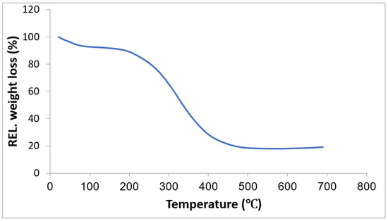 The thermal stability of the two adsorbents, ARs and ABs, was investigated using TGA analysis. Additionally, the results generated were captured and reported accordingly, as shown in Figure 7 and Figure 8 for ARs and ABs, respectively. The TGA of Figure 7 shows mass change at a temperature range of 0–200 °C due to the loss of moisture content in the AR. Between 200 and 500 °C, there is a sharp drop in mass, which is most likely due to the loss and decomposition of the volatile component. The curve is straight at temperatures above 500 °C, indicating that only carbon remained at that temperature. In Figure 8, there is a change in mass from 0 °C to approximately 220 °C, corresponding to moisture content released from ABs. Between 220 and 550 °C a sharp decrease in mass and this could be due to the decomposition of organic matter. At 550 °C, there is no change in the mass with temperature [29,30].