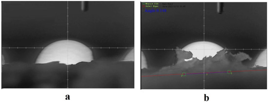 Contact angle for AB adsorbent: (a) before adsorption; (b) after adsorption.