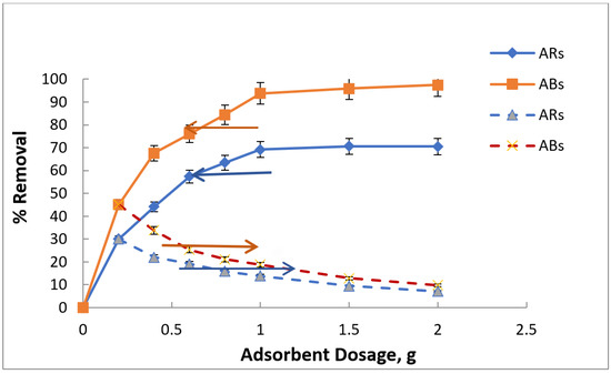 The effect of varying doses of two adsorbents (ABs and ARs) on the removal of oil from the water was investigated by utilizing different dosages ranging from 0.2 to 2 g. The findings revealed that increasing the adsorbent dose led to an increase in the percentage removal of oil and a decrease in the adsorption capacity of the adsorbent, as illustrated in Figure 11. The rise in the percentage removal of oil with the increase in the adsorbent dose is due to an increase in the number of active sorption sites available on the adsorbent’s surface. Furthermore, an increase in the adsorbent dose led to an increase in the number of unsaturated sites, which, in turn, caused lower adsorption capacity with an increase in the adsorbent dose. This observation aligns with the outcomes of earlier studies. [8,19,21,22].