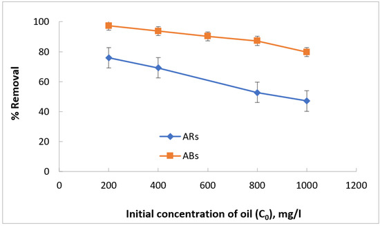 The impact of oil concentration in the oil–water mixture has been investigated, as shown in Figure 12. This study was conducted using different initial oil concentrations (200, 400, 600, 800, and 1000 mg/L), 1 g of ABs and AR adsorbents, 6.5 pH of the solution, 25 °C temperature, and 60 min contact time. The figure shows that the percentage removal of oil decreases with an increase in the initial concentration of oil for both adsorbents used. This can be explained by the fact that the surface of the adsorbent contains a limited number of adsorbent sites and, therefore, insufficient to accommodate the increase in oil concentration [20,21].