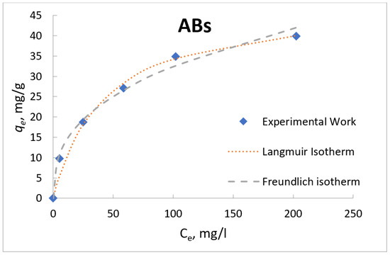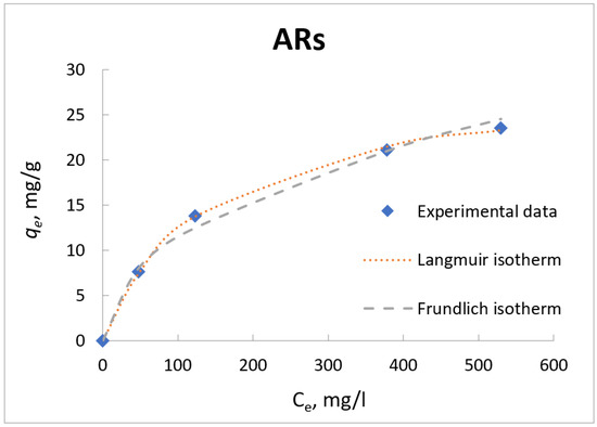 The adsorption isotherm data in the present work was described using two common isotherm models, the Langmuir [32], and the Freundlich as shown in Figure 13 and Figure 14 for ARs and ABs, respectively.