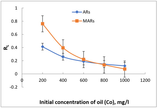The values of separation factor RL at different initial concentrations of oil for the ABs and AR adsorbents.