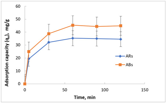 The kinetics of adsorption process is strongly influenced by time, which is an important parameter to describe the process. Figure 16 illustrates the trend of adsorption capacity for ABs and AR adsorbents as a function of time. It is evident from the figure that the adsorption capacity of both adsorbents increased with increasing time. The initial adsorption rate was fast, and the adsorption capacity reached a maximum within the first 30 min. However, a gradual decrease in the rate of adsorption capacity was observed between 30 and 60 min. After 60 min, the adsorption capacity became constant with the progression of time. This equilibrium state in adsorption capacity after 60 min may be attributed to the occurrence of a balance between the adsorption and desorption processes after the surface of the adsorbent material became saturated with oil.