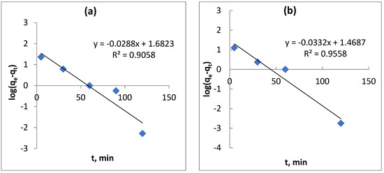 where qe (mg/g) and qt (mg/g) are the sorption capacity at equilibrium and at time t, respectively, k1 (1/min) is the rate constant of pseudo-first order. The integrating of Equation (8) and applying the boundary conditions qt = 0 at t = 0 and qt = qt at t = t gives the following linear equation: