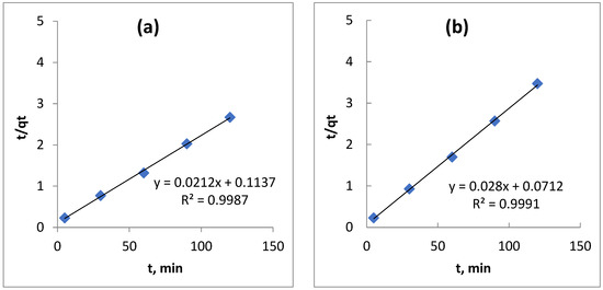 where k2 (g/mg.min) is the rate constant of pseudo-second order. The integrating of Equation (12) and applying the boundary conditions qt = 0 at t = 0 and qt = qt at time t = t gives the following different for of linearized equations: