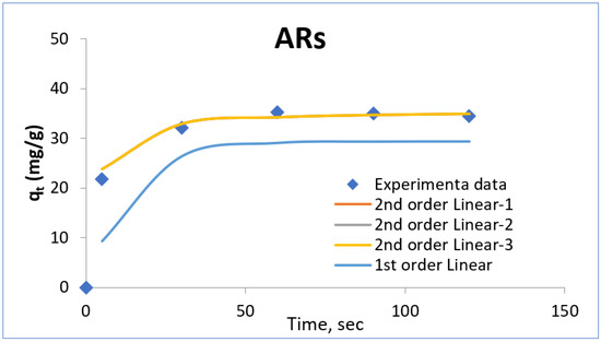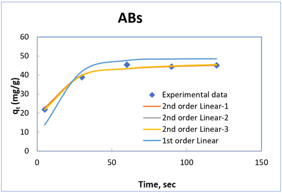 In the present adsorption, kinetics data of adsorption of oil onto ABs and ARs were analysed using pseudo-first-order (Equation (11)) and pseudo-second-order (Equation (13)) models, as shown in Figure 17 and Figure 18, respectively.