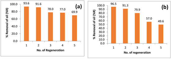 The process of regenerating adsorbent involves eliminating oil or impurities from spent adsorbent by utilizing a specific solvent that can remove oil and impurities. Regeneration is an environmentally and economically beneficial process since it decreases the volume of waste by reducing the disposal issues of spent adsorbents and the requirement for new adsorbents [44]. Various methods, such as biological, thermal, chemical, and photochemical methods [45], are utilized to desorb pollutants from the adsorbent. In this study, the regeneration process was conducted using hot water as a thermal method. The spent adsorbent was rinsed several times with hot water at 100 °C to release oil from spent adsorbent, and then the rinsed adsorbent was dried and used for oil adsorption to evaluate its oil removal capacity after regeneration. Multiple regeneration attempts were conducted after each adsorption process, and the regeneration conditions were 50 mL of 400 mg/L oil–water mixture and 2 g of adsorbent. Figure 21a,b demonstrate the regeneration process of AR and AB after four attempts. The results indicate that for AR, the percentage removal (%R) decreased from 93.6% for the first use to 69.9% for the fourth regeneration attempt, as depicted in Figure 21a. Similarly, for AB, the %R declined from 96.5% for the first use to 49.6% for the fourth regeneration attempt, as shown in Figure 21b.