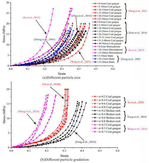 A large number of laboratory tests have been carried out on the compaction and the water permeability of caving broken rock masses. Figure 1 shows the compaction stress–strain curves [7,8,9,10,11,12,13] of broken rocks such as gangue, mudstone and shale with different particle size gradations. The stress–strain curves of caving rock masses with different particle sizes and gradations show approximately exponential relationships during compaction. The strain at the initial stage of compaction rapidly increases with stress, and the growth rate of strain gradually decreases with increasing stress. Fan et al. [14] and Zhang et al. [15] performed laboratory tests to divide the compaction process of caving rock masses into three stages: the initial compaction stage, the gradual compaction stage and the stable compaction stage. The porosity and the water permeability gradually decrease with the compaction stage. The internal relationship between the compaction stress, the real-time compaction and the water permeability at different locations of the caving zone has been quantitatively analyzed. Wang et al. [7] performed compression tests on broken rocks with different particle sizes and showed that the strain growth rate of large particle size specimens is smaller than that of small particle size specimens at the beginning of loading. With increasing stress, the strain growth rate of large particle size specimens exceeds that of small particle size specimens. Su et al. [10] carried out a compaction test on broken mudstone from a roof to verify the influence rule of particle size on strain. It was concluded that the radial strain of the mixed block with 20% uniformity mixing of different block diameters was small and that the compression resistance was improved. Huang et al. [16] analyzed the influence of the gradation and confining pressure conditions of caving rock masses on their deformation and failure characteristics. It was concluded that the maximum bearing stress of caving rock masses is sensitive to the confining pressure condition and insensitive to the particle size and gradation. The maximum bearing stress linearly increases with increasing confining pressure, while the degree of fracture is significantly affected by the gradation of the caving rock mass but almost independent of the confining pressure condition. Liu et al. [17] and Qin et al. [18] carried out the lateral limit compression test on broken rock and found that the sectional modulus, tangential modulus, porosity, expansion coefficient and compactness of caving rock masses are negatively correlated with the Talbol index.